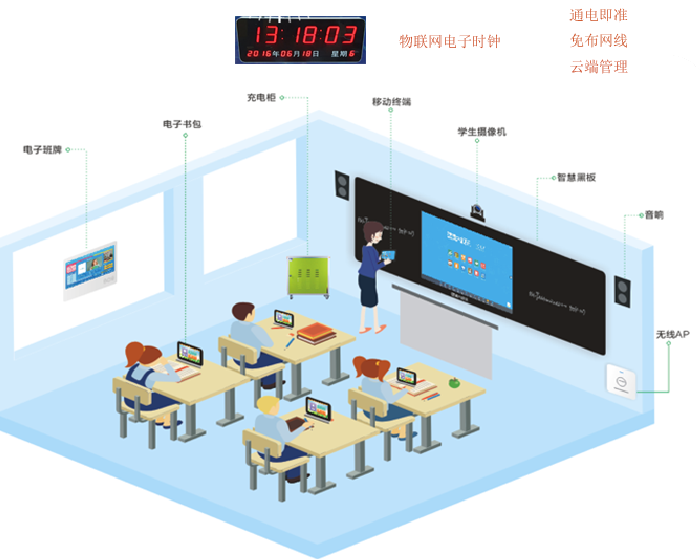 教学楼:在每间教室里可配置壁挂式网络时钟(年月日、时分秒),以及在考试时作为开始、结束的指标时间。走廊上可配置吊顶式双面时钟。